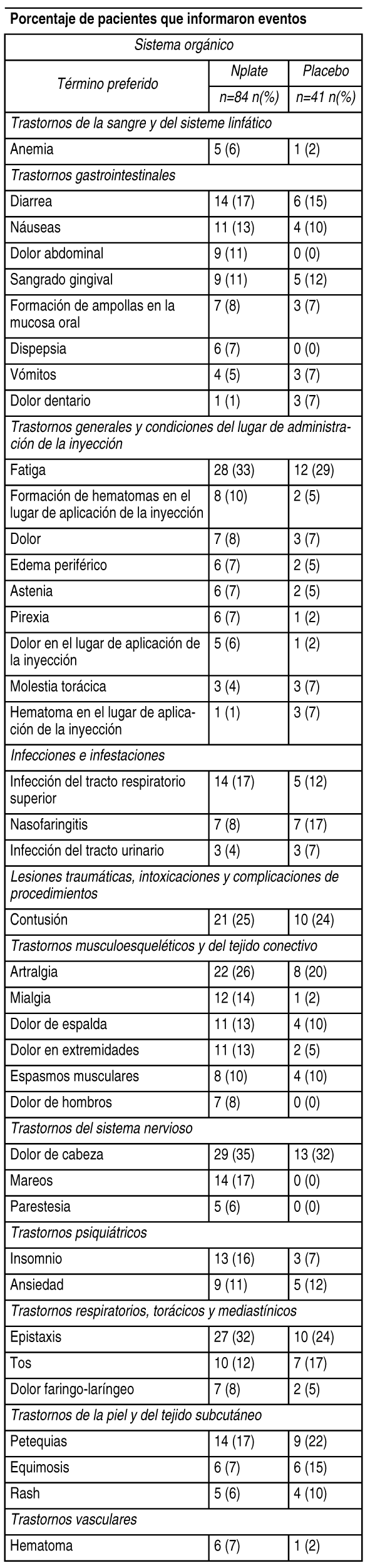 En la Tabla 1, se muestran los eventos adversos informados en ensayos clínicos en fase 3. Teniendo en cuenta el análisis de todos los pacientes que recibieron Nplate en 2 estudios controlados con placebo, se informaron eventos adversos en 39 (95%) pacientes que recibieron placebo (n = 41) y en 84 (100%) que recibieron Nplate (n = 84). La mayoría de estos eventos fueron leves a moderados; el 27% se clasificaron como severos. Los eventos adversos que se informaron con más frecuencia fueron dolor de cabeza, artralgia y mareos. Usualmente, los dolores de cabeza fueron leves o moderados y se manejaron con analgésicos no narcóticos.
