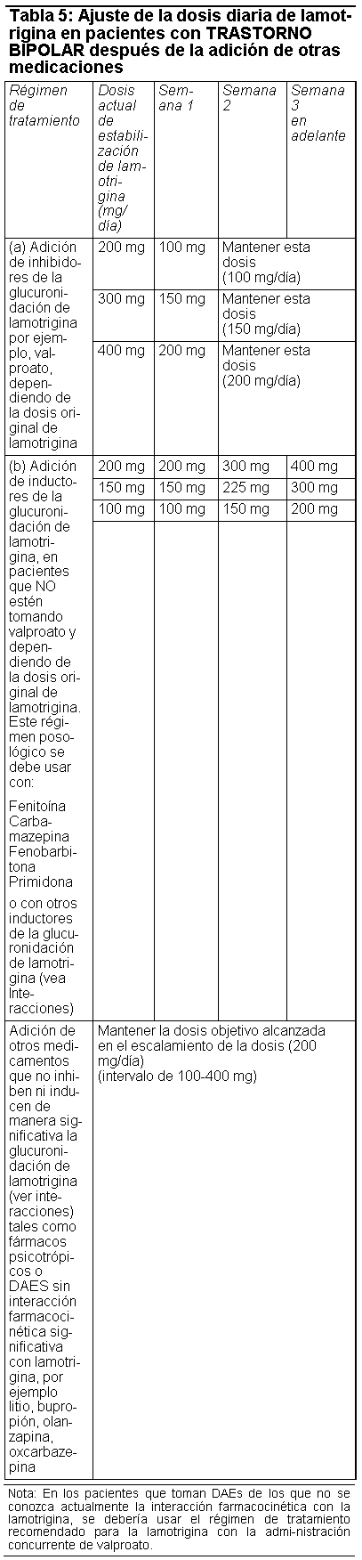 (a) Luego del retiro de terapia adjunta con inhibidores de la glucuronidación de lamotrigina p.ej., valproato: Una vez terminado el valproato, se debe aumentar la dosis de Lamictal al doble de la dosis original de estabilización deseada y mantenerla así. (b) Luego del retiro de terapia adjunta con inductores de la glucuronidación de lamotrigina, dependiendo de la dosis original de mantenimiento. Este régimen se debe usar con fenitoína, carbamazepina, fenobarbitona, primidona u otros fármacos conocidos por inducir la glucuronidación de Lamictal (vea Interacciones): A medida que se retiran los inductores de la glucuronidación se debe reducir gradualmente la dosis de Lamictal en el transcurso de tres semanas. (c) Después de la discontinuación de la terapia adjunta con otros medicamentos que no inhiben ni inducen de manera significativas la glucoronidación de lamotrigina (ver Interacciones); tales como fármacos psicotrópicos o DAEs sin interacción farmacocinética clínica por ejemplo, litio, bupropión, olanzapina, oxcarbazapina: Durante todo el retiro de otros medicamentos se debe mantener la dosis deseada lograda con el programa de escalamiento de dosis. Ajuste de la dosis diaria de Lamictal en pacientes con trastorno bipolar después de la adición de otros medicamentos: No existe experiencia clínica en el ajuste de la dosis diaria de Lamictal luego de agregar otros medicamentos. Sin embargo, con base en los estudios sobre interacciones farmacológicas, se pueden hacer las siguientes recomendaciones (vea la Tabla 5, a continuación):