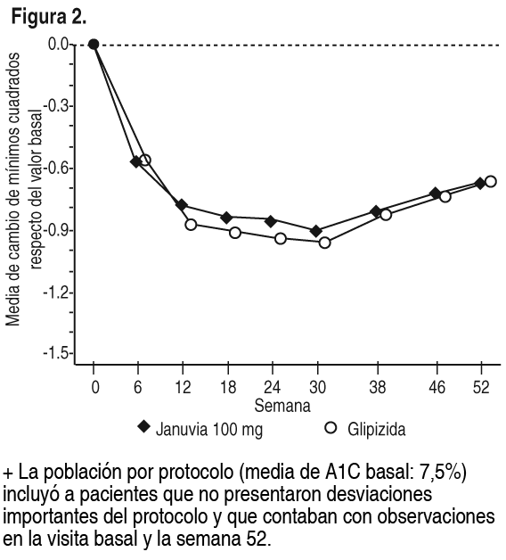 Terapia de adición de sitagliptina comparada con Glipizida en pacientes diabéticos tipo 2 controlados inadecuadamente con metformina: La eficacia de sitagliptina se evaluó en un estudio de no-inferioridad de 52 semanas, doble ciego y controlado con glipizida, conducido en pacientes con diabetes tipo 2. Los pacientes que no estaban recibiendo tratamiento o que no tomaban otros hipoglicemiantes ingresaron a un período de introducción de hasta 12 semanas de duración, de monoterapia con metformina (dosis ³ 1.500 mg diarios) y lavado de medicamentos distintos de metformina, si procedía. Después del período introductorio, los pacientes con control glicémico inadecuado (A1C de 6.5% a 10%) fueron asignados aleatoriamente, en proporción 1:1, a recibir tratamiento adicional con sitagliptina 100 mg 1 vez al día o glipizida, durante 52 semanas. Los pacientes asignados al grupo de glipizida recibieron una dosis inicial de 5 mg/día, la que posteriormente se aumentó gradualmente y de manera electiva en el transcurso de las 18 semanas siguientes hasta un máximo de 20 mg/día, según fuera necesario para optimizar el control de la glicemia. A partir de entonces, la dosis de glipizida debía mantenerse constante, excepto cuando fuese necesario reducirla para evitar hipoglicemia. La dosis promedio de glipizida después del período de ajuste fue 10 mg. Después de 52 semanas, las reducciones promedio de A1C respecto del valor basal fueron similares al comparar sitagliptina con glipizida, en el análisis de la población con intención de tratar (Tabla 13). Los resultados fueron consistentes con lo observado en el análisis por protocolo (Figura 2). La conclusión a favor de la no-inferioridad de sitagliptina frente a glipizida podría estar limitada a pacientes con valores basales de A1C comparables a los de los pacientes incluidos en el estudio (más del 70% de los pacientes tenían una A1C basal <8%, y más del 90% tenía una A1C basal <9%).