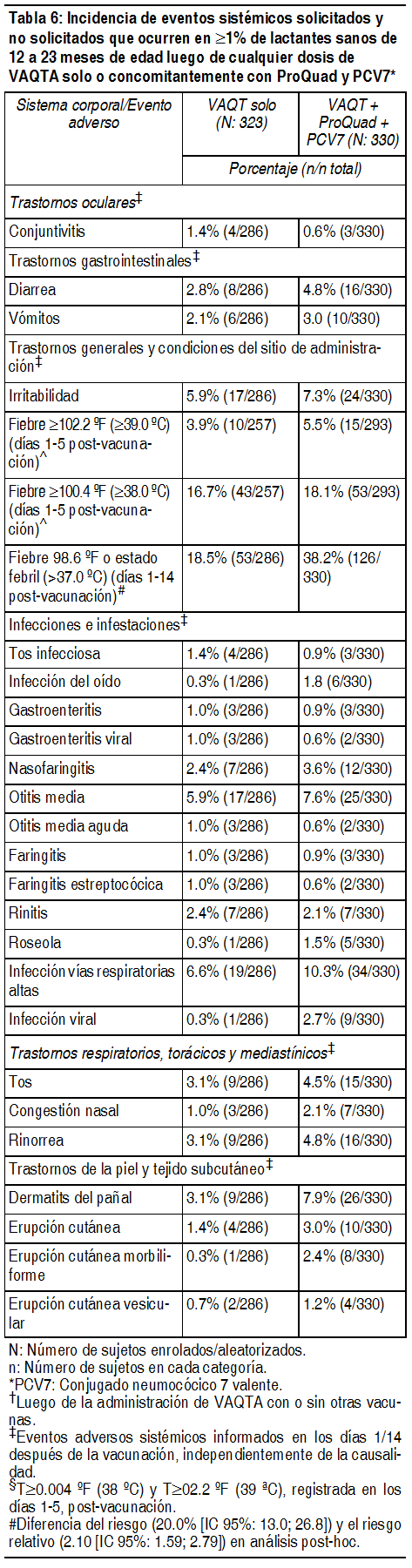 En un estudio clínico abierto, 653 niños de 12 a 23 meses de edad fueron aleatorizados para recibir una primera dosis de Vaqta con ProQuad y Prevenar4 (vacuna conjugada neumocócica 7- valente) concomitantemente (N=330) o una primera dosis de ProQuad y vacuna neumocócica conjugada 7-valente concomitantemente y luego vacunados con Vaqta 6 semanas más tarde (N=323). Aproximadamente 6 meses más tarde, los sujetos recibieron, ya sea, la segunda dosis de ProQuad y Vaqta concomitantemente o la segunda dosis de ProQuad y Vaqta en forma separada. La distribución por raza de los sujetos que recibieron Vaqta con o sin ProQuad y la vacuna conjugada neumocócica 7-valente es la siguiente: 60.3% caucásicos; 21.6% afroamericanos; 9.5% hispanoamericanos; 7.2% otros; 1.1% asiáticos y 0.3% nativos americanos. La distribución de sujetos por género fue de 50.7% hombres y 49.3% mujeres. Las Tablas 5 y 6 presentan las reacciones adversas en el sitio de inyección (días 1 a 5 post-vacunación con Vaqta) y los eventos adversos sistémicos (días 1 a 14 post-vacunación con Vaqta) observadas entre los receptores de Vaqta concomitantemente con ProQuad y la vacuna conjugada neumocócica 7-valente y Vaqta administrado en forma separada de ProQuad y la vacuna conjugada neumocócica 7-valente en un porcentaje de al menos 1% luego de cualquier dosis de Vaqta. Entre todos los sujetos, fiebre (>98.6°F ó 37°C o estado febril) fue el evento adverso sistémico más frecuente y el dolor/sensibilidad en el sitio de inyección fue la reacción adversa en el sitio de inyección más frecuente. En los 14 días posteriores a la vacunación con cualquier dosis de Vaqta, el porcentaje de fiebre (>98.6 °F ó 37 °C o estado febril) se incrementó en los sujetos que recibieron Vaqta con ProQuad y la vacuna conjugada neumocócica 7-valente en comparación a Vaqta solo (diferencia del riesgo (20.0% [IC 95%: 13.0, 26.8]) y riesgo relativo (2.10 [IC 95%: 1.59, 2.79] en análisis a posterior). Se observó una diferencia en los porcentajes de fiebre después de la dosis 1 de Vaqta con ProQuad y la vacuna conjugada neumocócica 7-valente, pero no después de la dosis 2 de Vaqta con ProQuad. Los porcentajes de fiebre ³ 100.4 °F (38 °C) y ³ 102.2 °F (39 °C) en los 5 días posteriores a la vacunación fueron similares en ambos grupos de tratamiento (Tabla 6). En los 28 días posteriores a la vacunación, la administración de la dosis 1 de Vaqta con la dosis 1 de ProQuad y la dosis 4 de la vacuna conjugada neumocócica 7-valente no aumentó los porcentajes de incidencia de fiebre (>98.6°F ó 37°C o estado febril) en comparación a cuando ProQuad fue administrado solo con la vacuna conjugada neumocócica 7-valente {38.6% y 42.7%, respectivamente; riesgo relativo (0.9 [IC 95%: 0.75, 1.09])} en análisis a posteriori). En forma similar, la administración de la dosis 2 de Vaqta con la dosis 2 de ProQuad no aumentó los porcentajes de incidencia de fiebre (>98.6 °F ó 37 °C o estado febril) en comparación a cuando la dosis 2 de ProQuad se administra sola {17.4% y 17.0%, respectivamente; riesgo relativo (1.02 [IC 95%: 0.70, 1.51])}.
