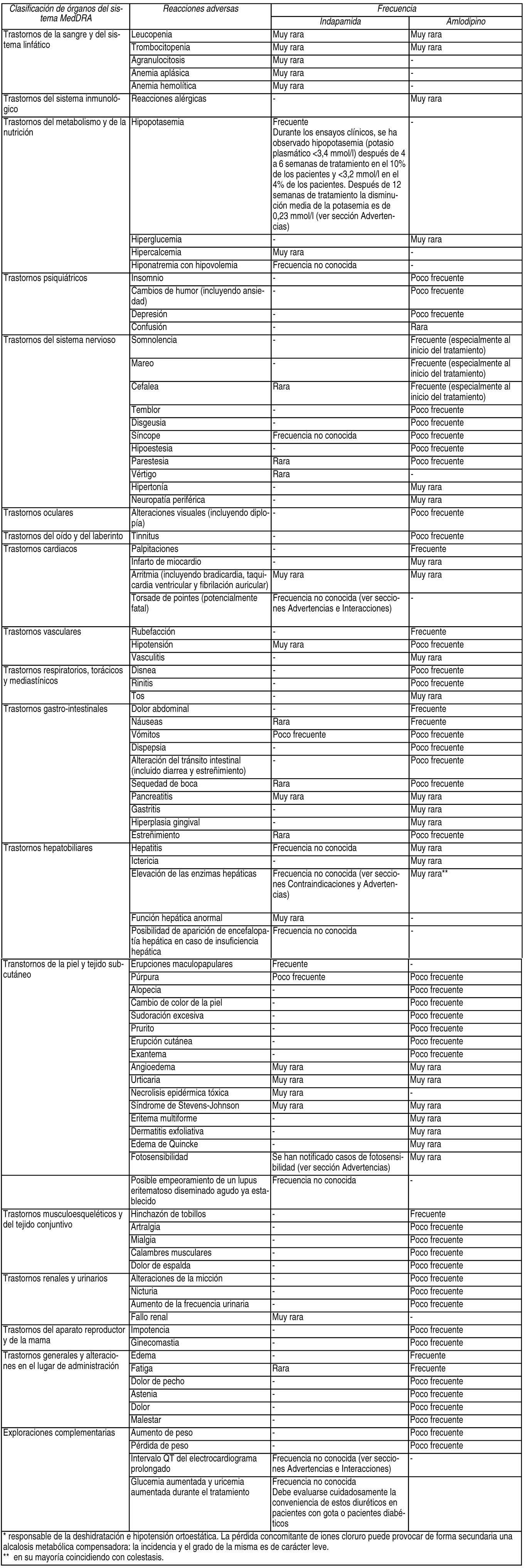 Resumen del perfil de seguridad: Las reacciones adversas más frecuentemente notificadas con indapamida y amlodipino administrados de forma separada son: Somnolencia, mareos, cefalea, palpitaciones, rubefacción, dolor abdominal, náuseas, hinchazón de tobillos, edema y fatiga. Lista tabulada de reacciones adversas: Las siguientes reacciones adversas han sido observadas y notificadas durante el tratamiento con indapamida y amlodipino con las siguientes frecuencias: Muy Frecuentes ( ³ 1/10); Frecuentes ( ³ 1/100, <1/10); Poco frecuentes ( ³ 1/1.000, <1/100); Raras ( ³ 1/10.000, <1/1.000); Muy raras (<1/10.000); frecuencia no conocida (no puede estimarse a partir de los datos disponibles).