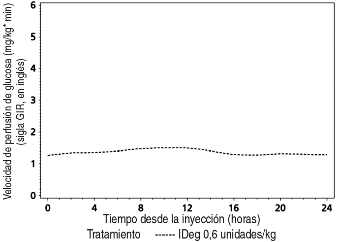 Figura 1: Perfil del índice de perfusión de glucosa, estado estable, regularizado - Perfil promedio de 0 - 24 horas - IDeg de 100 unidades/ml 0.6 unidades/kg - Estudio 1987. La duración de la acción de Tresiba® excede las 42 horas dentro del rango de dosis terapéutica. El estado estacionario ocurrirá después de 2-3 días de las administraciones de la dosis. La acción de reducción de glucosa que tiene la insulina degludec en estado estacionario muestra una variabilidad diaria 4 veces menor en términos de los Coeficientes de Variación (CV) para el efecto de reducción de glucosa durante 0 - 24 horas (AUCGIR,T,SS) y 2 - 24 horas (AUCGIR2-24h,SS) en comparación con la insulina glargina, ver la Tabla 1.