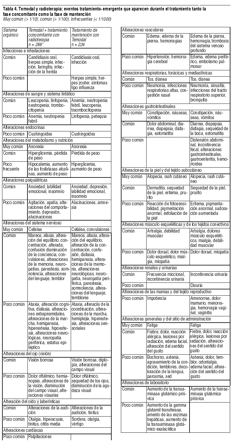 Pacientes adultos con diagnóstico de glioblastoma multiforme efectuado en fecha reciente: La Tabla 4 lista los efectos adversos que aparecen durante el tratamiento (la causalidad no fue determinada durante los ensayos clínicos) en pacientes con diagnóstico reciente de glioblastoma multiforme, tanto durante la fase concomitante como durante las fases de mantención del tratamiento.