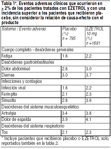 En la tabla 2 se presentan experiencias adversas clínicas reportadas en 2% de los pacientes y con una incidencia superior a la de los pacientes que recibieron placebo en 4 estudios clínicos controlados con placebo donde se administró Ezetrol solo o iniciado concomitantemente con varias estatinas, sin tomar en cuenta su relación de causa-efecto con el uso del producto.